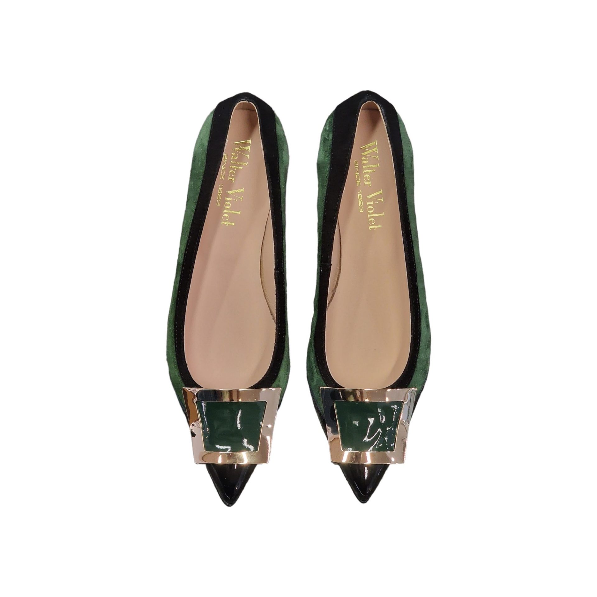 In camoscio e vernice a punta con accessorio vernice verde ed profilo dorato.