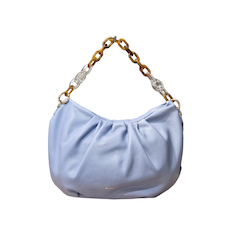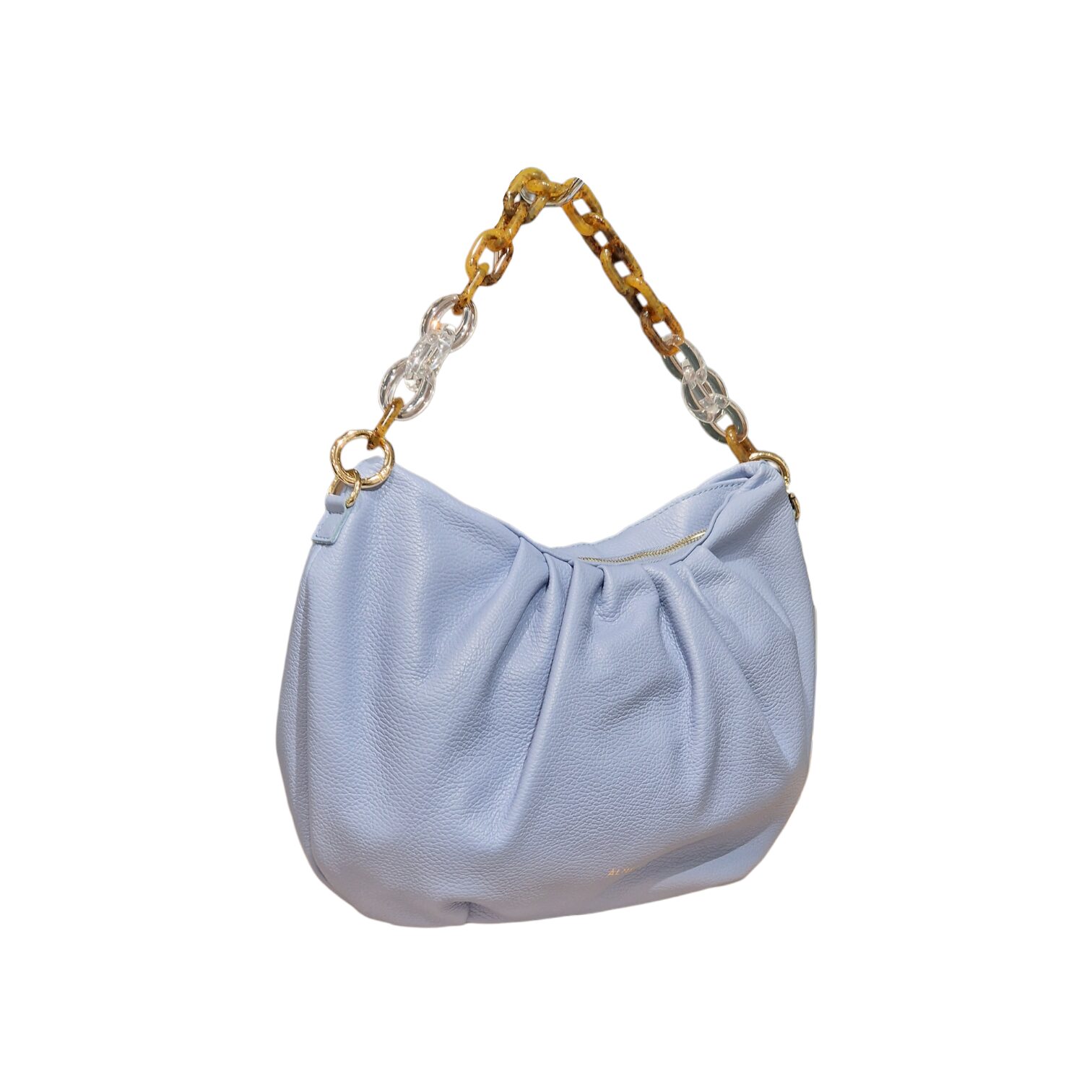 Borsa con maniglia singola a catena in acetato bicolore, ambra e trasparente, ideale per essere portata a mano oppure indossata a spalla. Le finiture in metallo dorato rifiniscono un prodotto di alto pregio. La cerniera dorata premium aggiunge un tocco di raffinatezza,mentre la tracolla in pelle tono su tono removibile offre la massima versatilità. L’interno, foderato in morbido tessuto, custodisce i tuoi preziosi con stile: un’ampia tasca principale è perfetta per gli oggetti di uso quotidiano, mentre le due tasche interne laterali sono ideali per riporre piccoli oggetti come cellulare, portafogli, occhiali e chiavi. Il logo dorato impresso a caldo sulla pelle completa il design con un tocco di eleganza. Più di una semplice borsa, questa creazione è un accessorio di classe che impreziosisce ogni outfit.Che tu sia diretta a un evento mondano o per una semplice passeggiata in città, questa borsa sarà la tua compagna inseparabile, sempre pronta a darti quel tocco di raffinatezza e di stile inconfondibile.