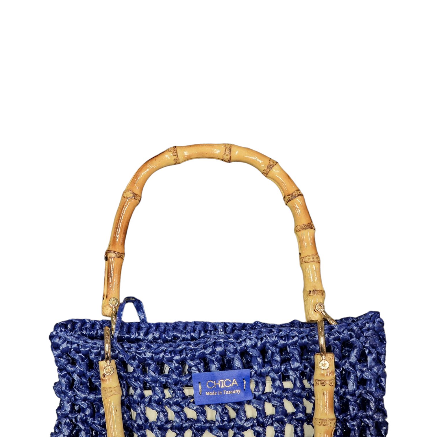 Borsa realizzata all’uncinetto. Manici in bambù e pochette interna in tessuto.