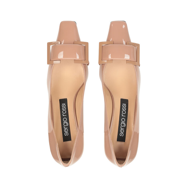 Décolleté a punta “sr Twenty” in vernice cipria. Il design è completato da un’elegante fibbia ton-sur-ton.