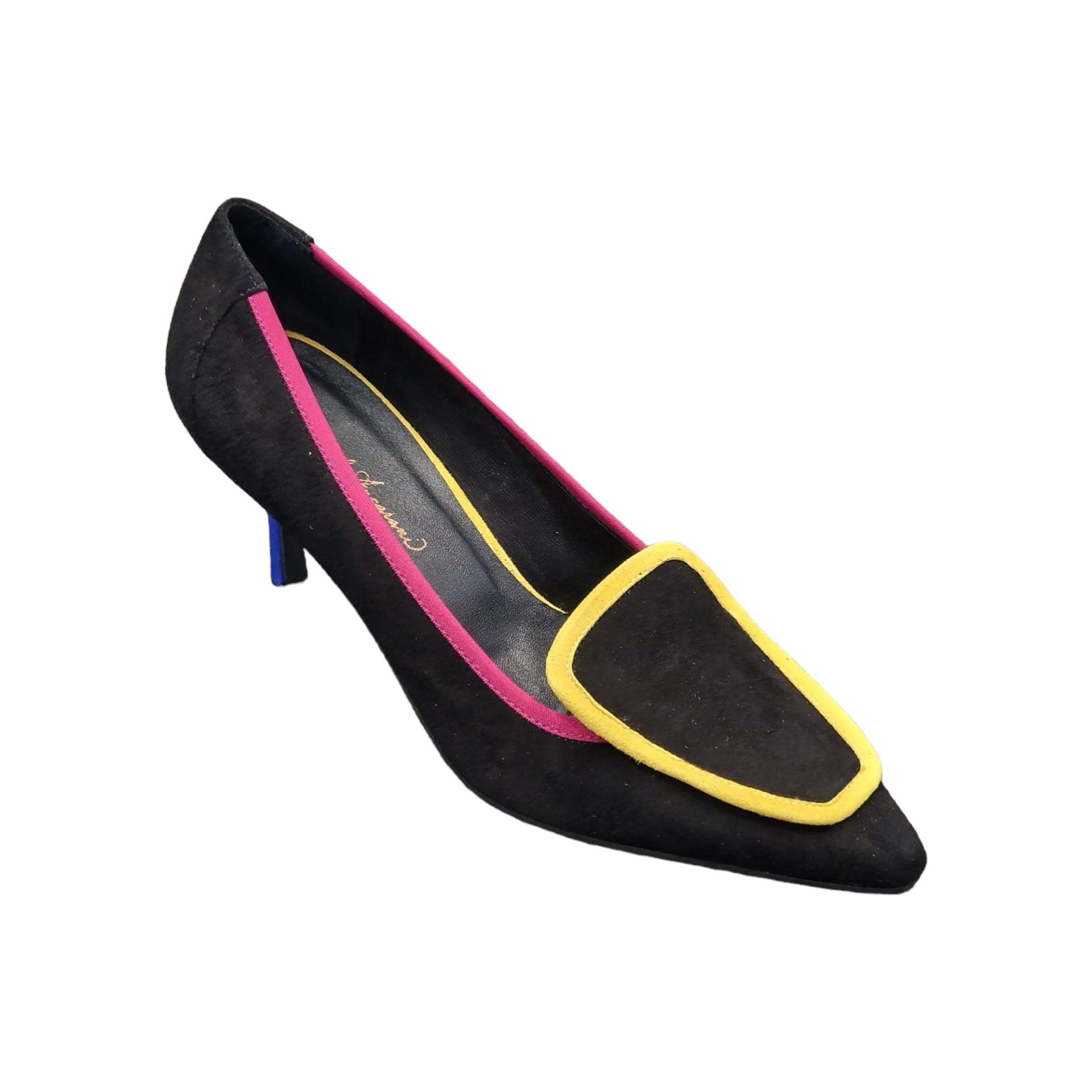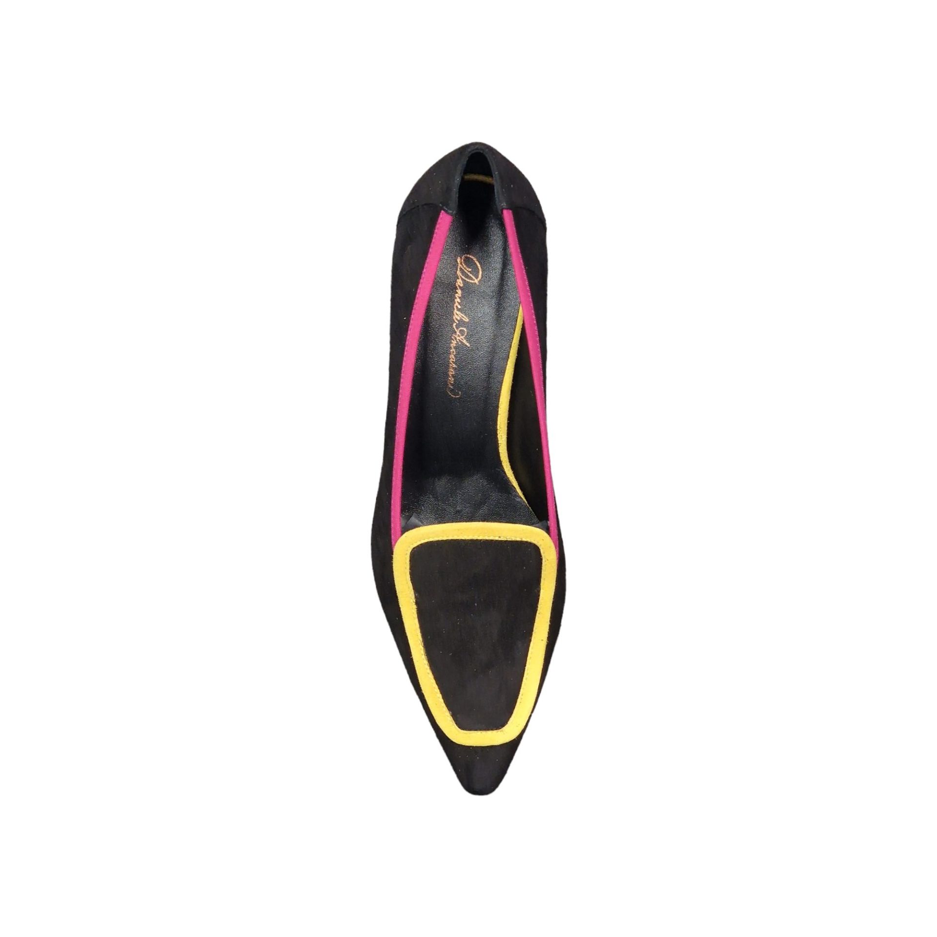 Décolleté realizzata in camoscio nero con riporti in camoscio multicolore. Punta con tacco italiano rivestito in camoscio.