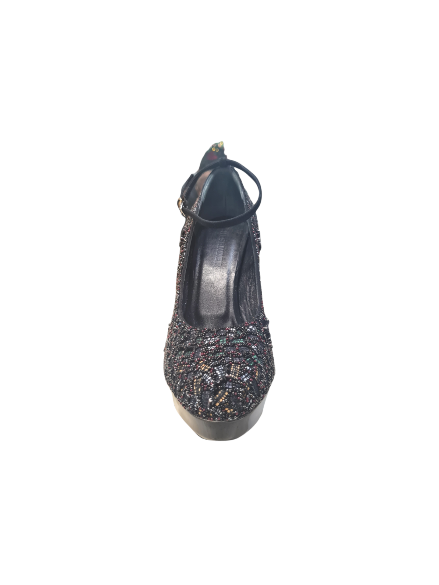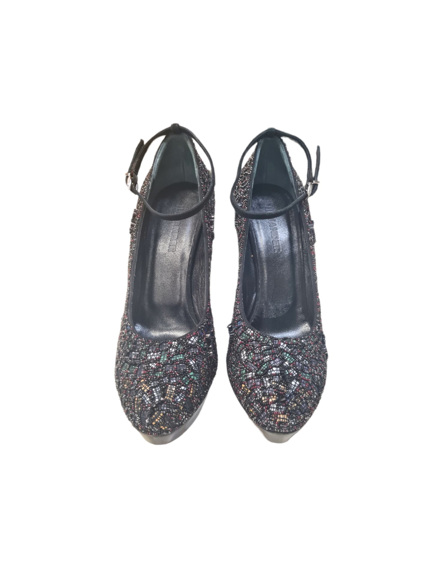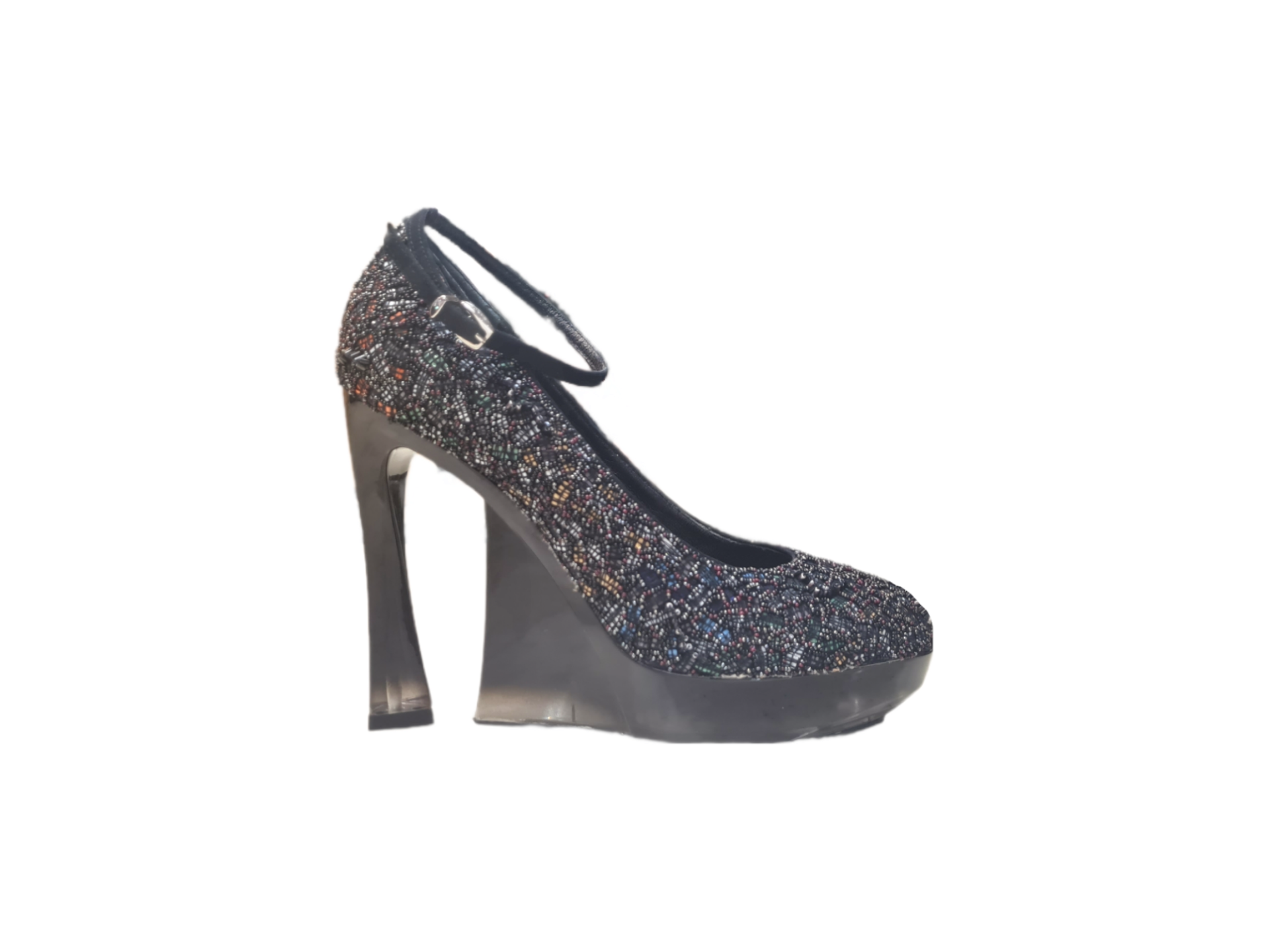 Décolleté Jil Sander con perline applicate tacco e plateau “sculture” in plexiglas fumè. Ampio scollo tondo, con cinturino alla caviglia,sinonimo di qualità e creatività. Tacco 125 mm; Plateau 30 mm.
