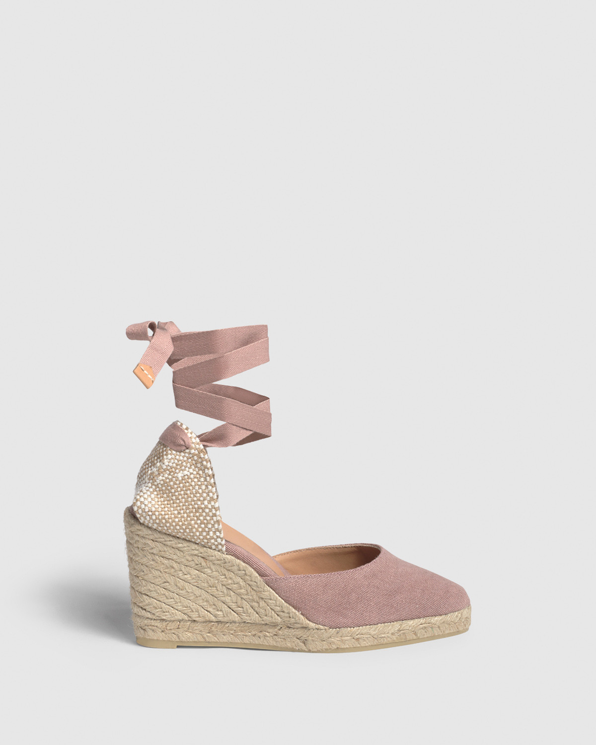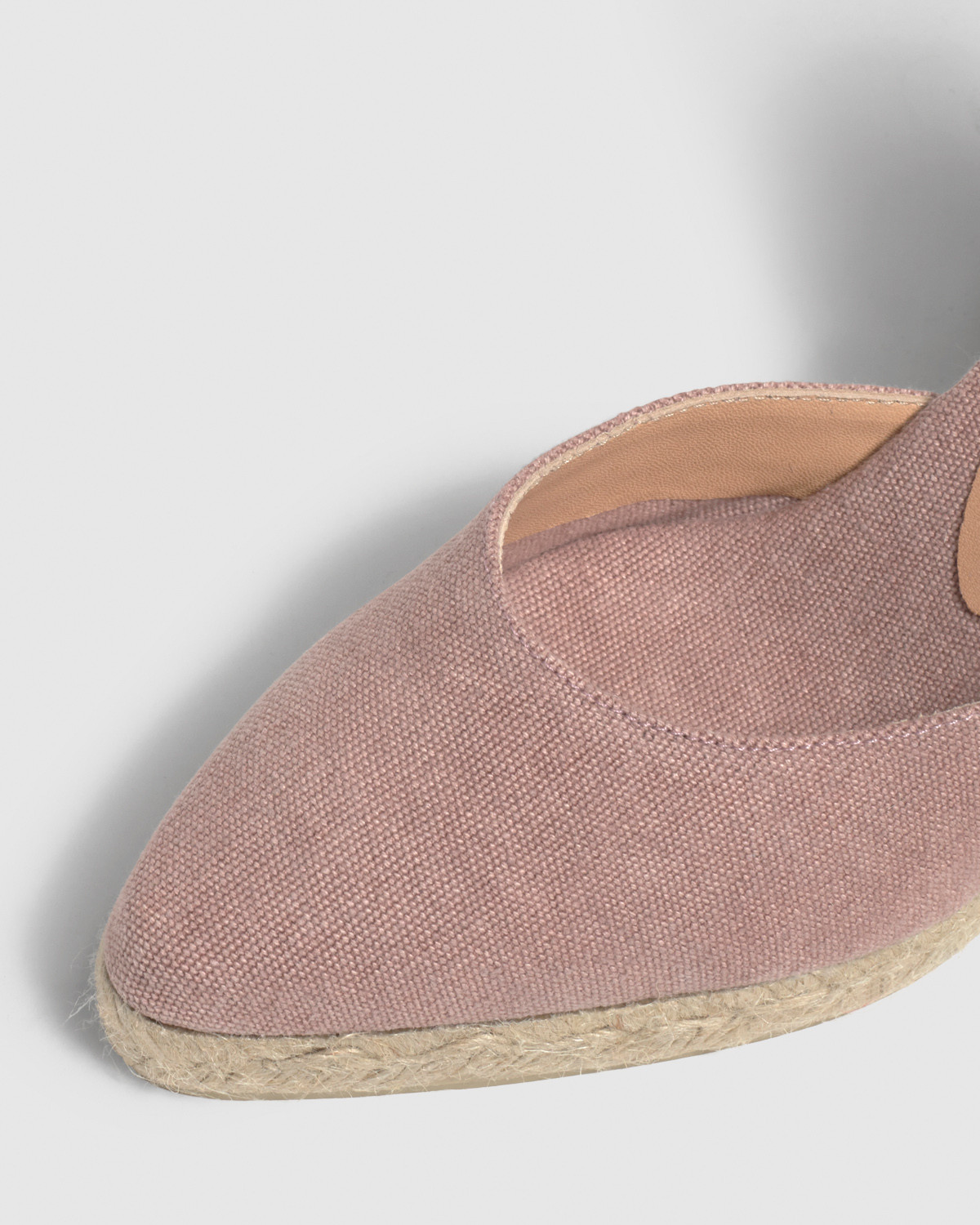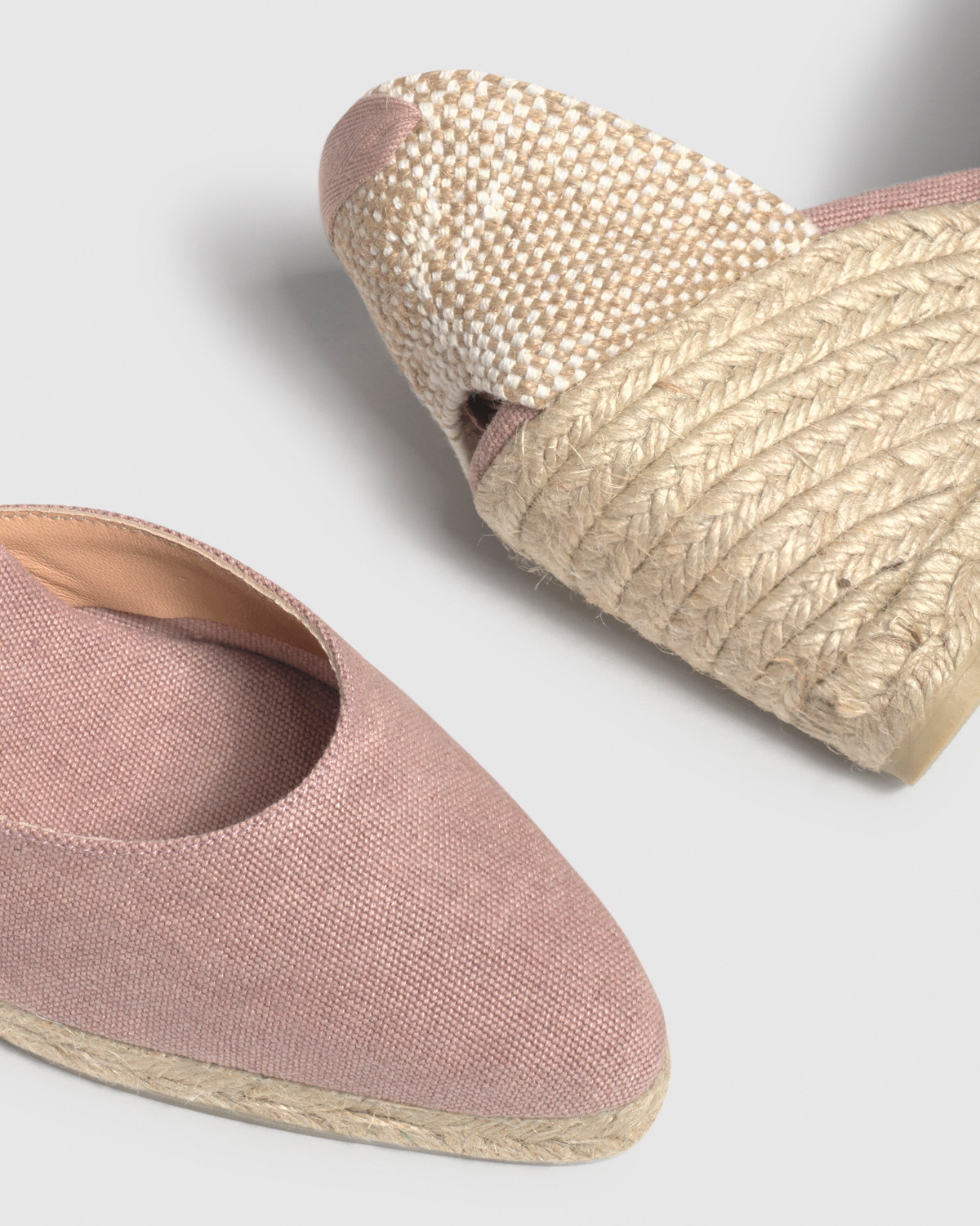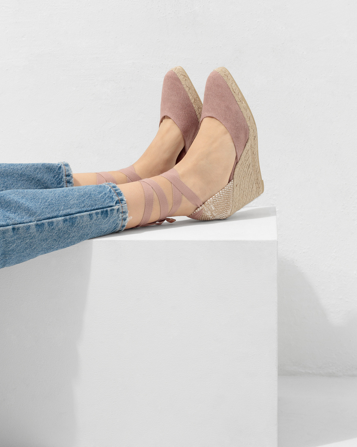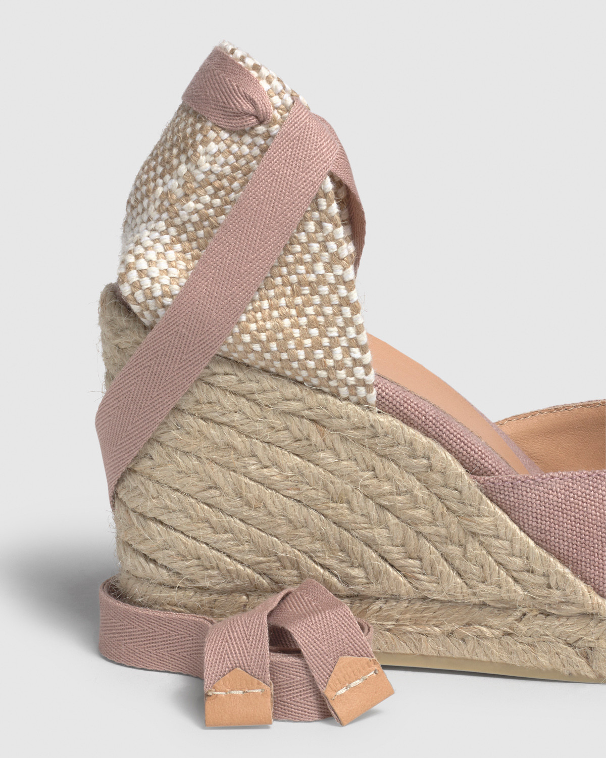 Espadrilles con zeppa realizzate in tela di cotone. Disegno con tessuto intrecciato sul tallone. Chiusura con nastri alla caviglia. Punta rotonda. Suola vulcanizzata di iuta colore naturale e caucciù.