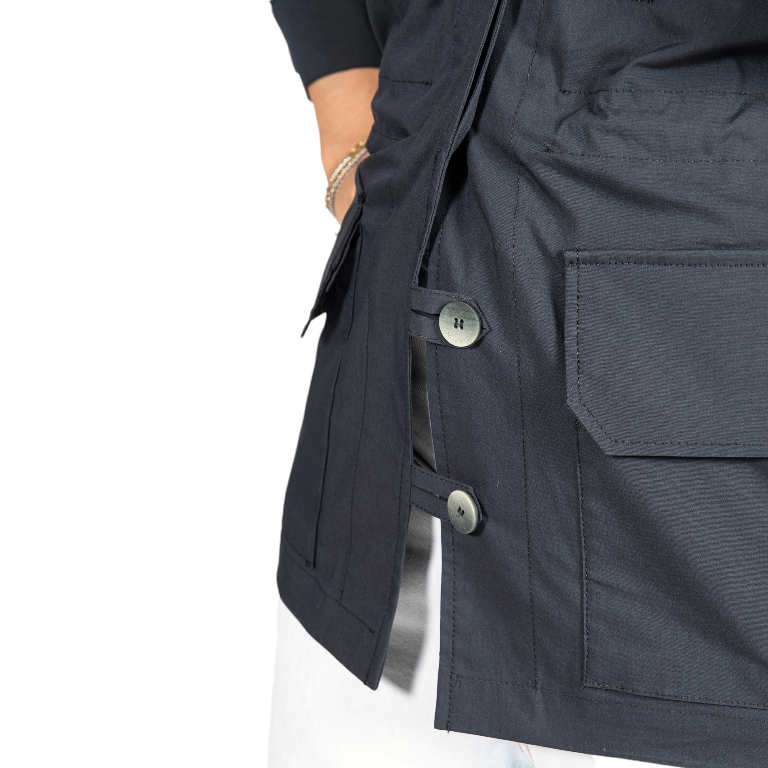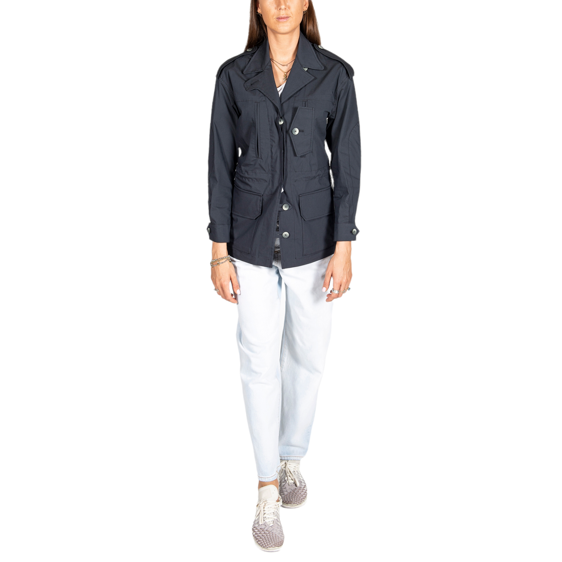 Giacca sahariana con abbottonatura monopetto, tasche asimmetriche. Spalla over con manica scesa, collo a camicia in perfetta army style.