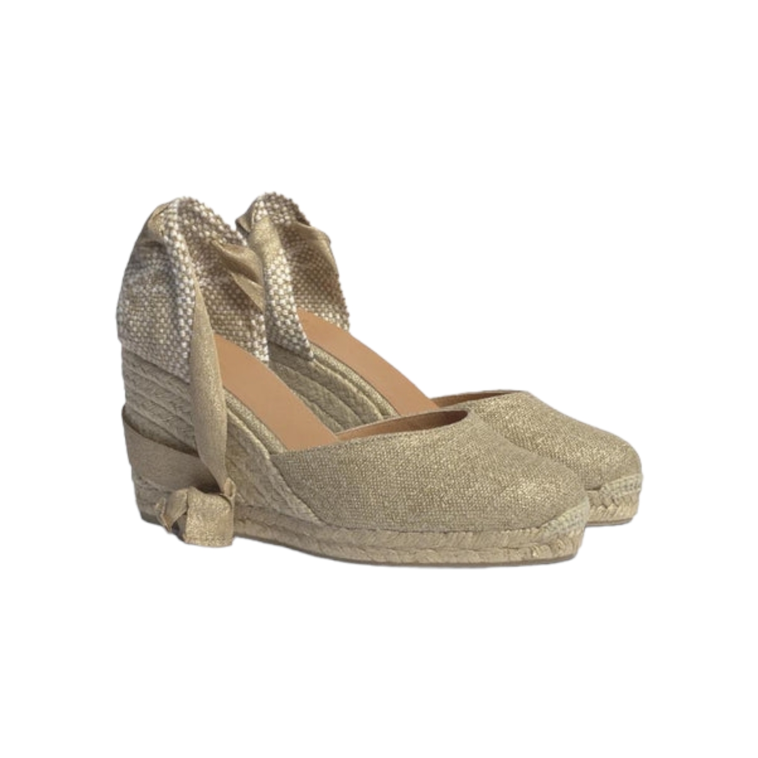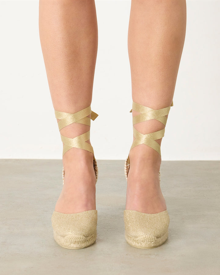 Carina è la nostra iconica espadrillas. Realizzato a mano in lino metallizzato e allacciato alla caviglia, ha un’altezza di 90 mm. Di solito è il protagonista delle feste.