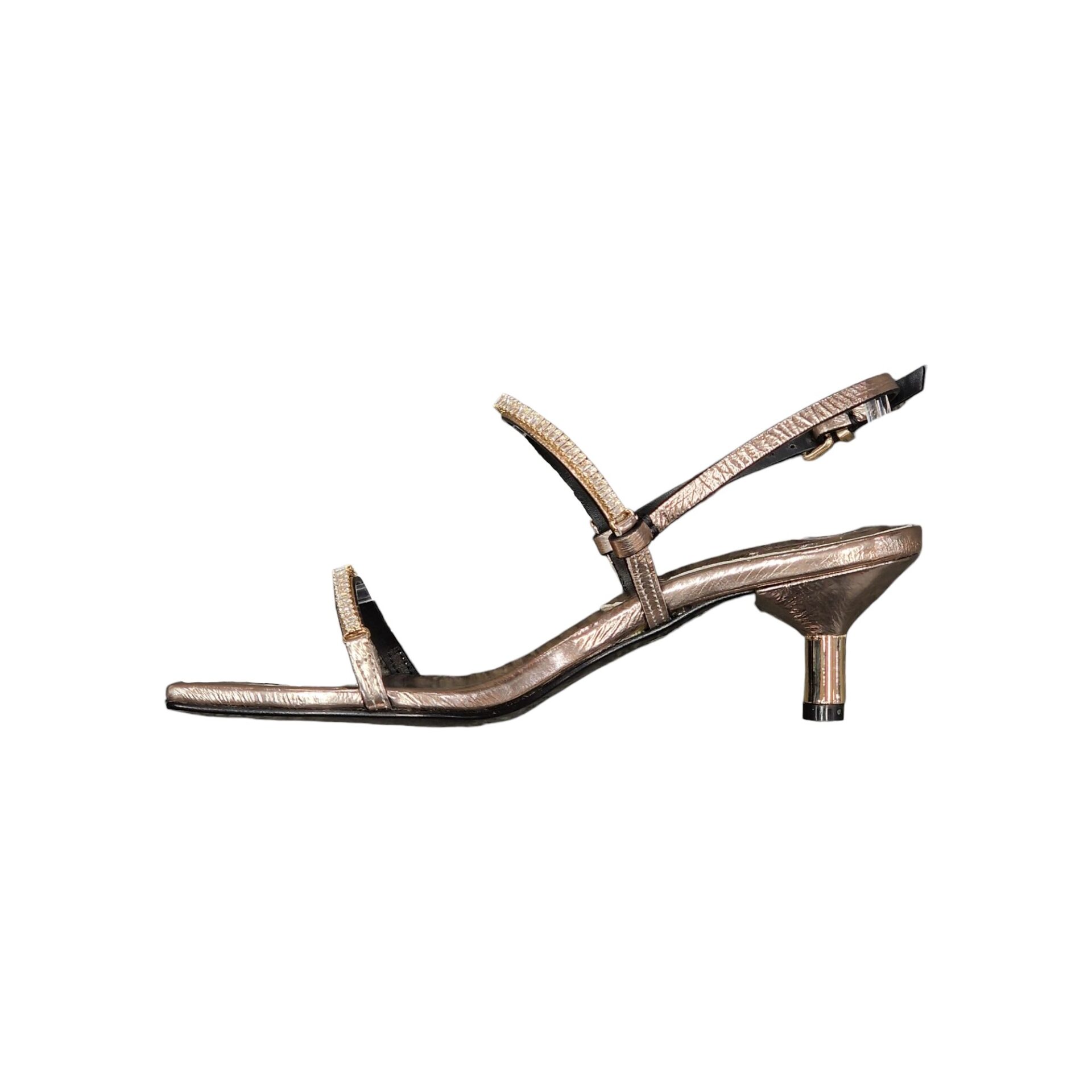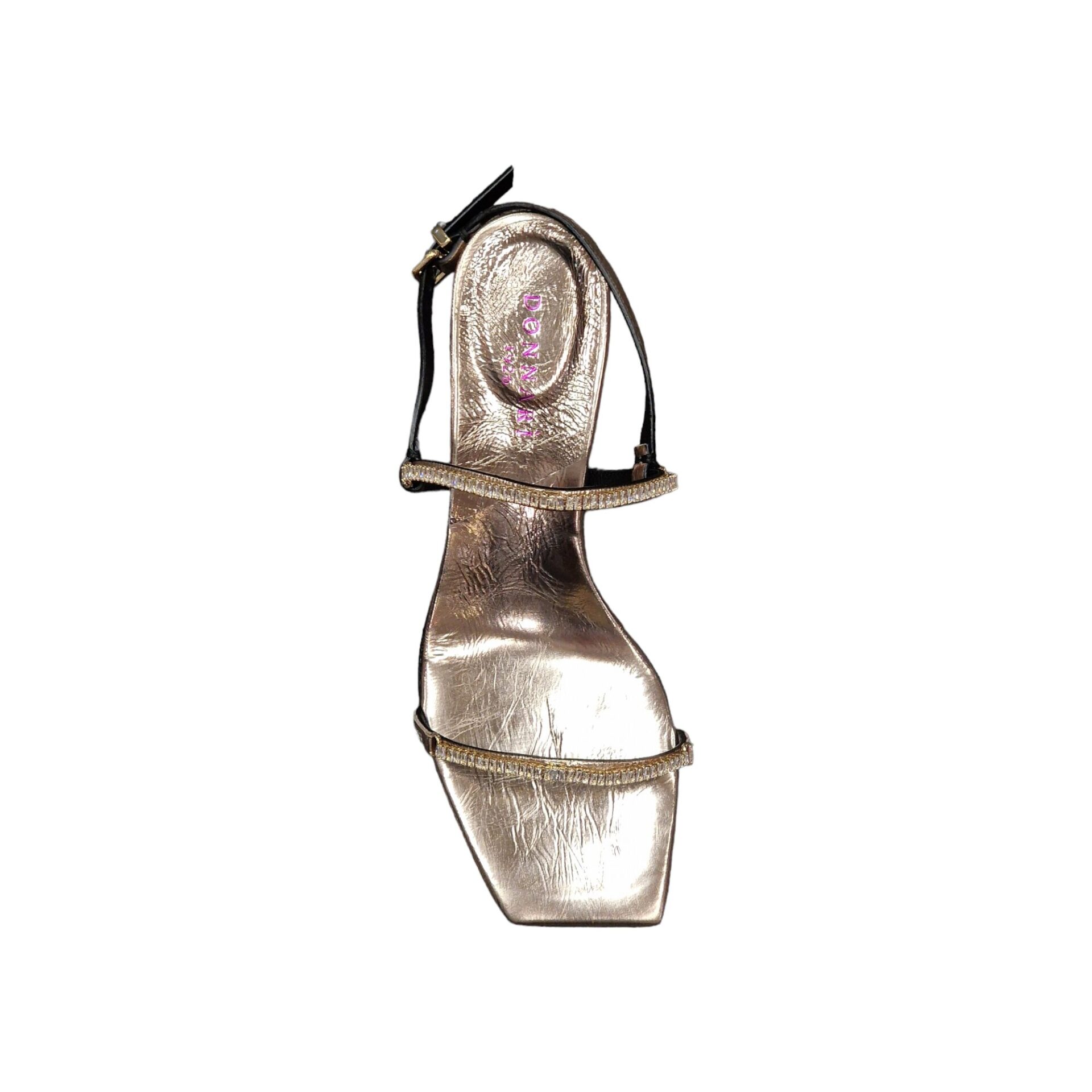 Sandalo in pelle impreziosito da strass, allacciato alla caviglia e con tacco ad imbuto.