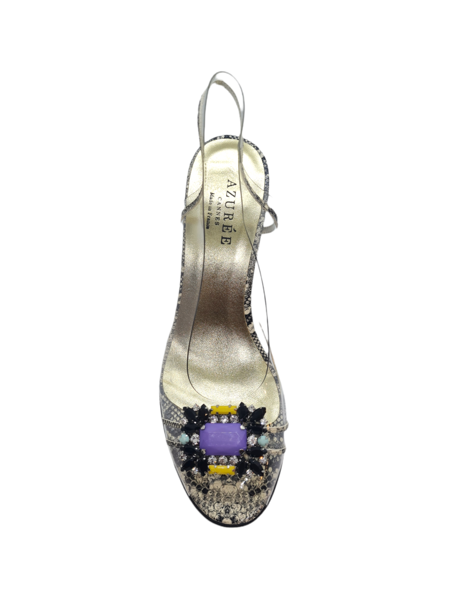 Sandalo con tacco alto in “cristallo” e pelle stampa serpente, decorato con un gioiello fantasia MARANI è un Sandalo d’Azurée elegante e confortevole made in France. È un sandalo disegnato e immaginato dai creatori di Azurée per mettere in risalto la tua figura.