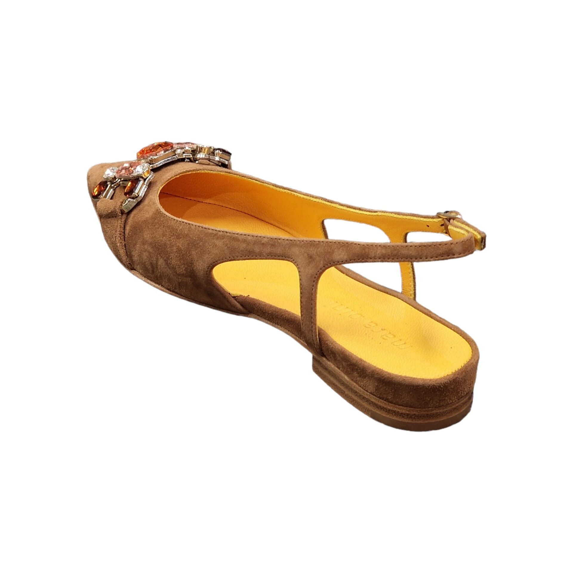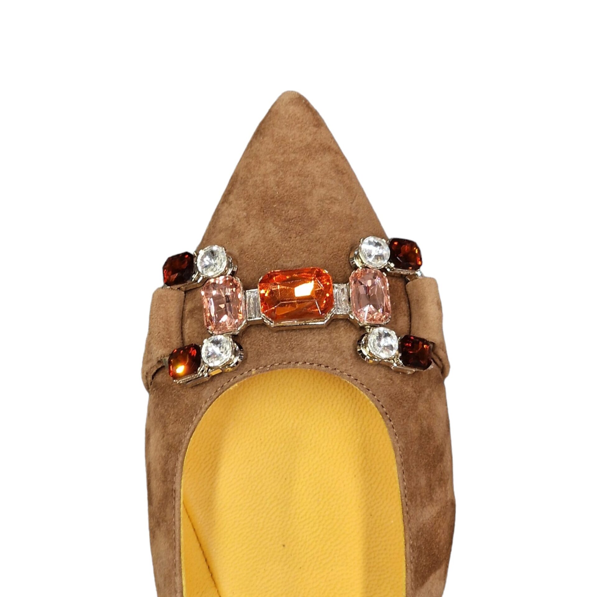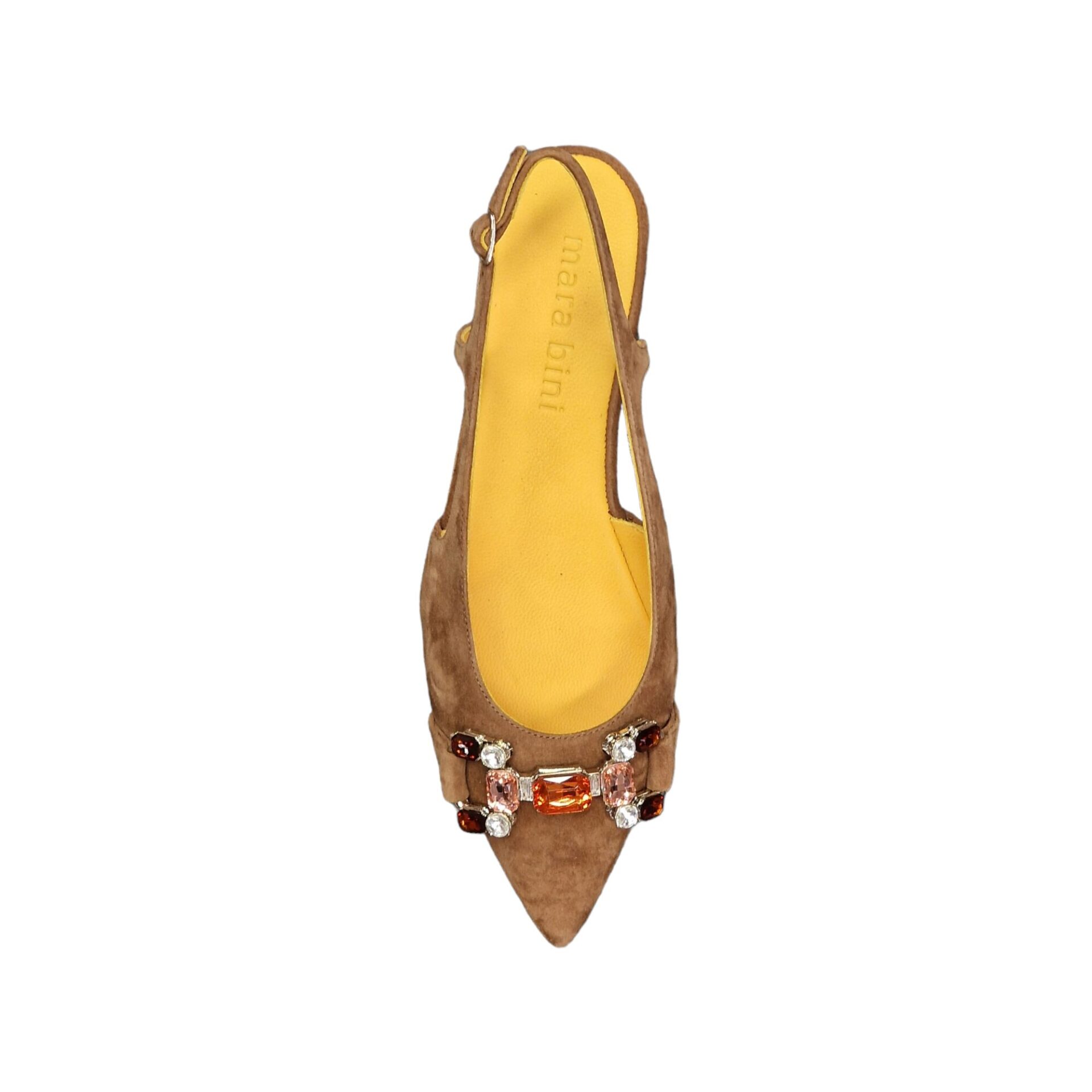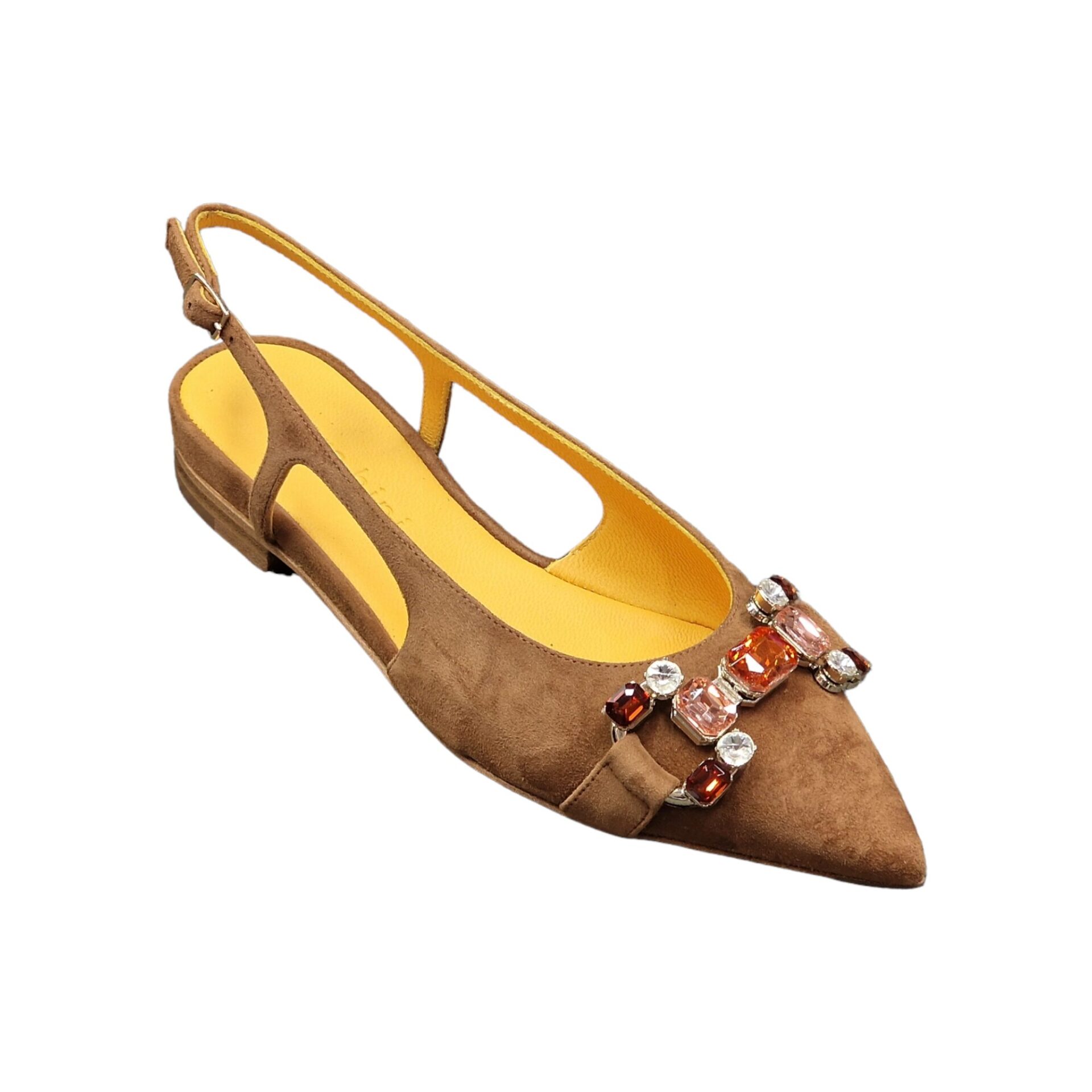 Sandalo Slingback sono realizzati in morbido suede cuoio. Presentano una punta chiusa con un accessorio morsetto impreziosito da Swarovski dalle diverse tonalità. Il tacco e la suola in vero cuoio antiscivolo offrono comfort e stabilità. Realizzate in Italia, queste ballerine sono perfette per la donna alla moda.