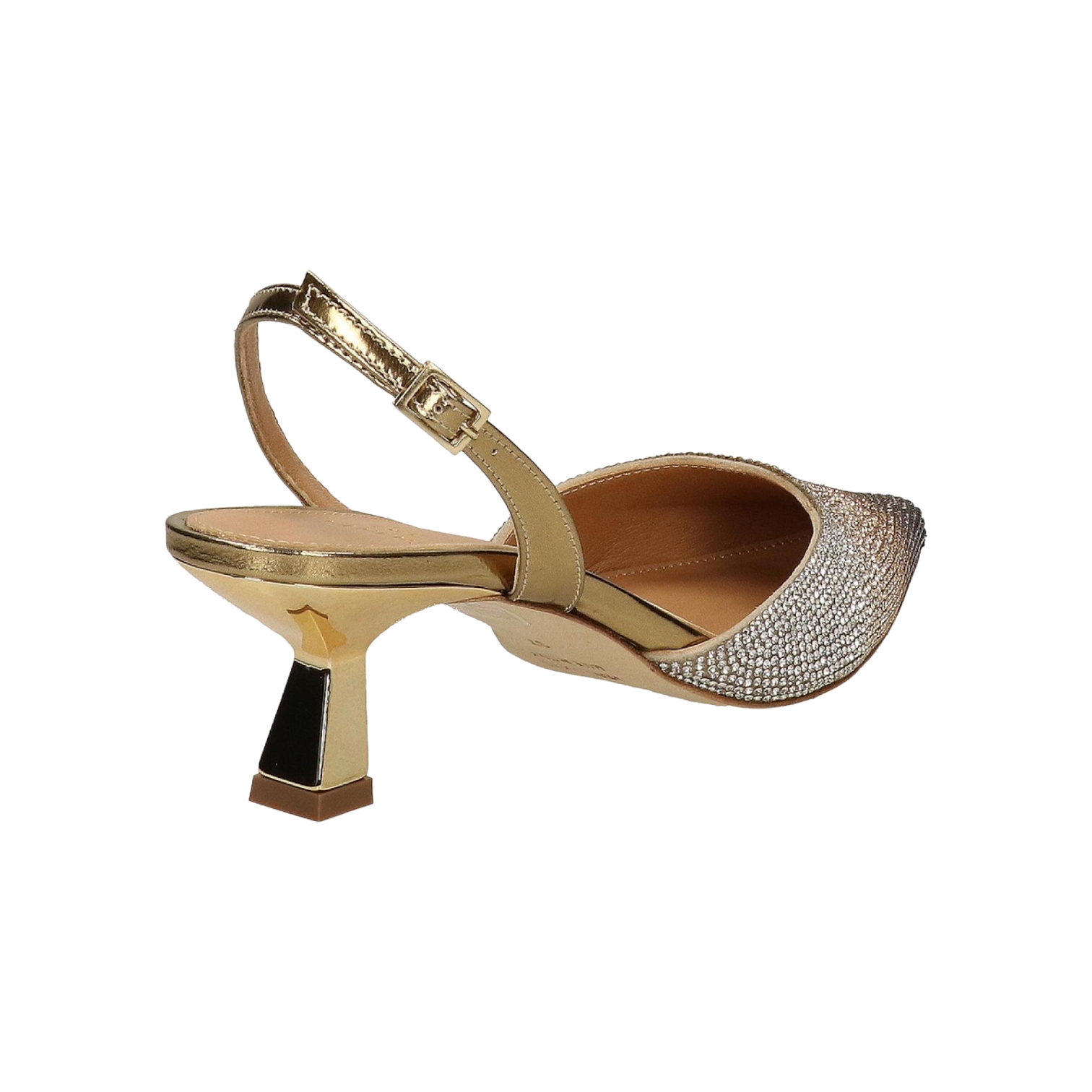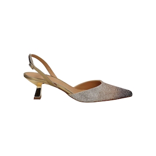 Scarpe décolleté slingback a punta in pelle platino impreziosite da cristalli sfumati sui toni del bronzo, tacco midi senza plateau, sul retro cinturino regolabile con chiusura con fibbia, suola interna in pelle, suola esterna in pelle, vestibilità regolare.