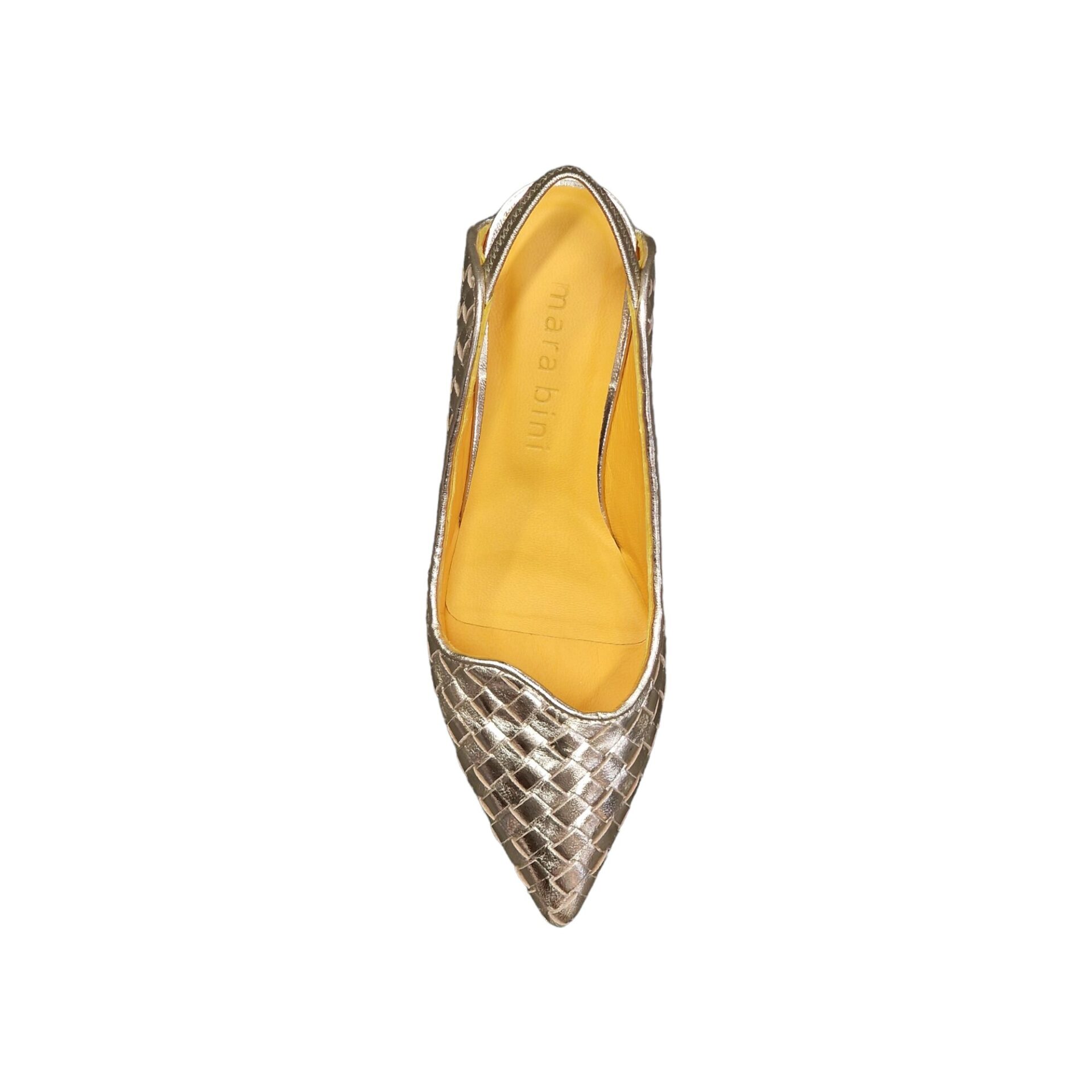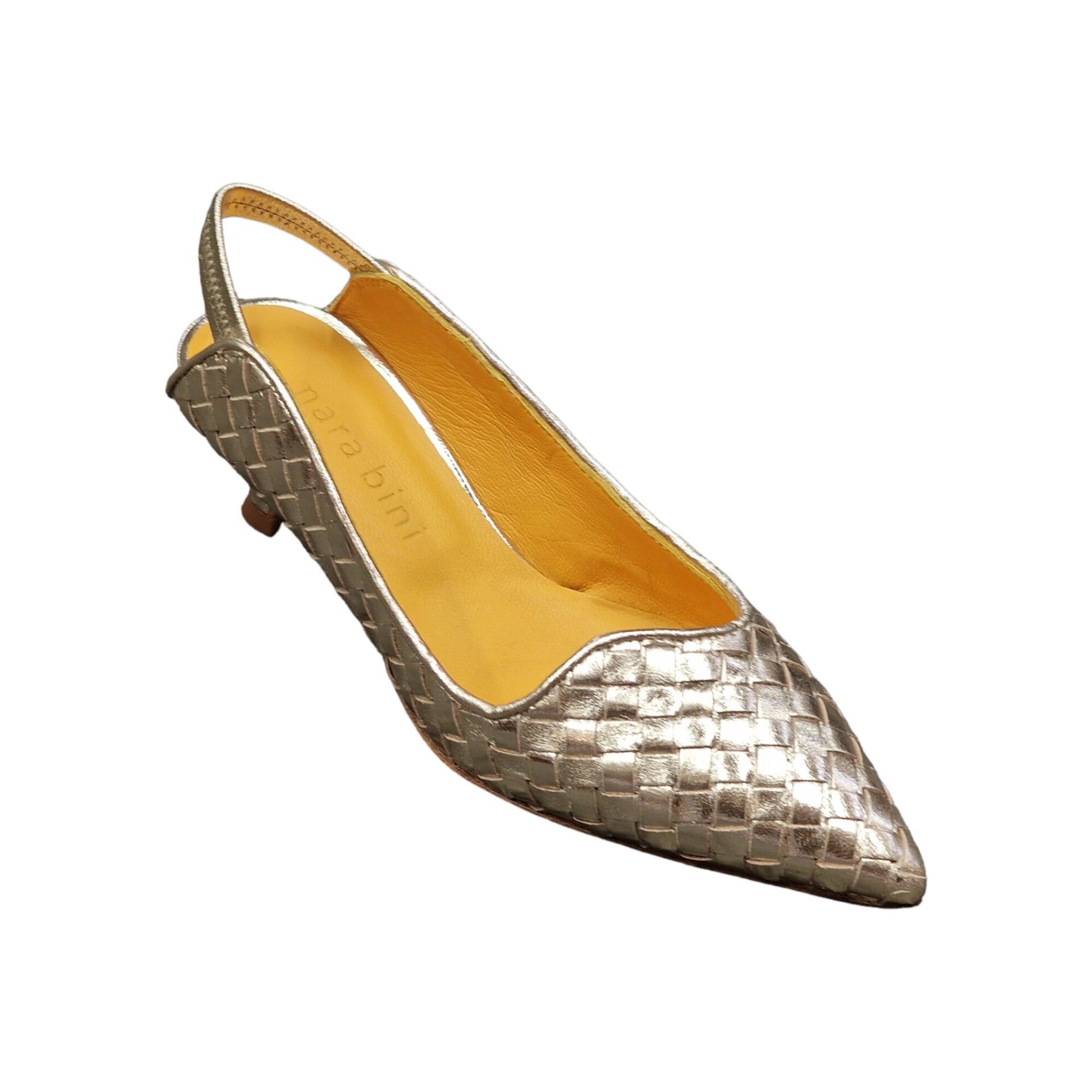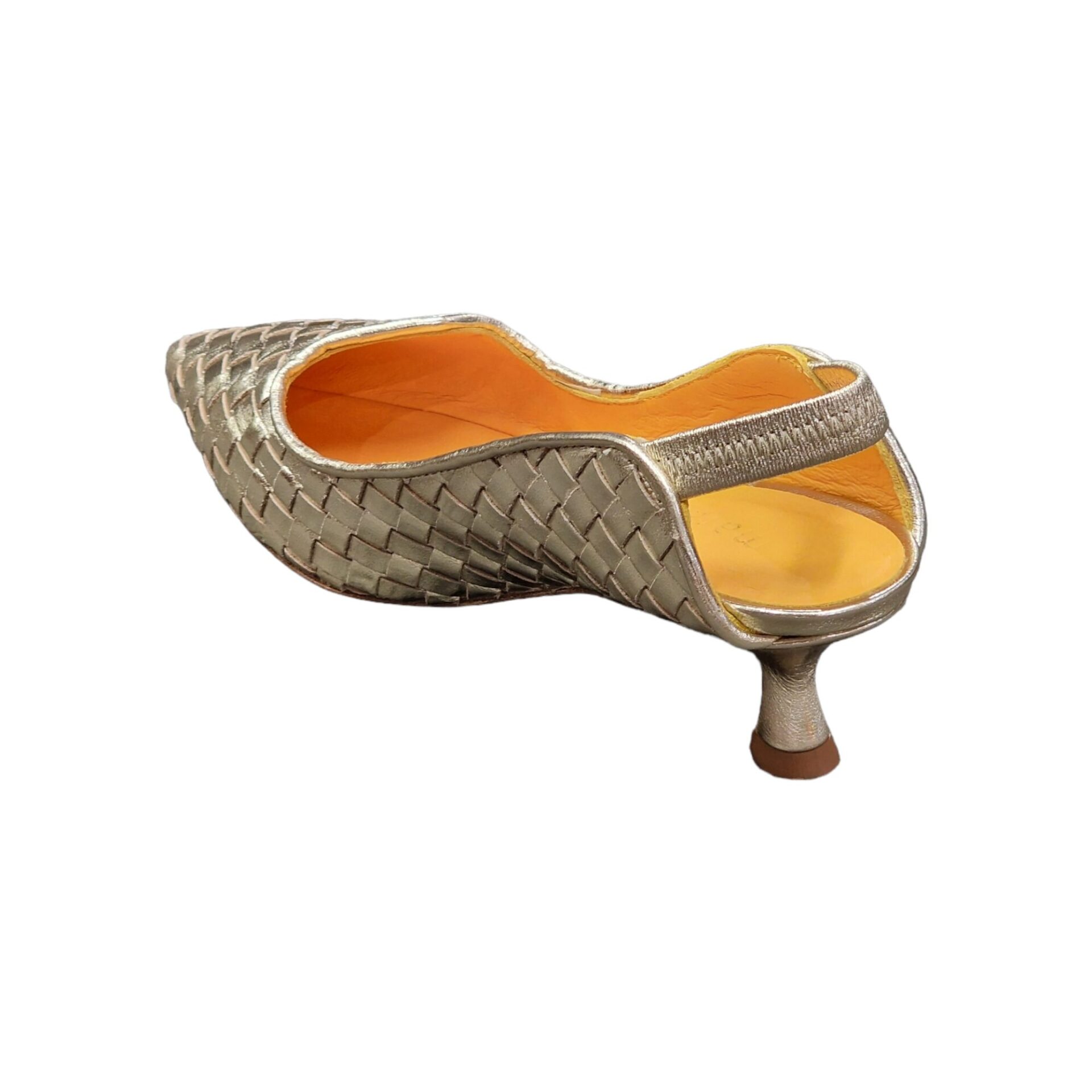 Slingback in pelle laminata intrecciata con lavorazione a sacchetto, che garantisce elevata comodità. Suola in vero cuoio con antiscivolo