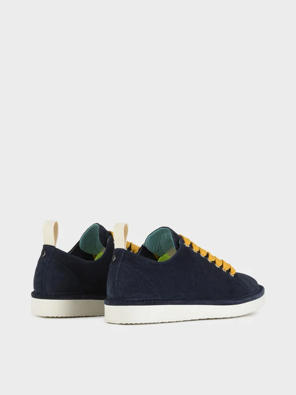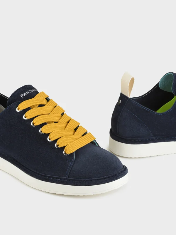 Scarpe allacciate P01 con tomaia in suede di colore blu notte, lacci a contrasto giallo a trama larga e interno sfoderato. La bordatura è realizzata in suede tono su tono con la tomaia. La versione estiva è caratterizzata da un peso piu’ leggero che migliora la sensazione di comfort. La P01 con le sue linee pulite rappresenta il perfetto equilibrio fra design e comfort.