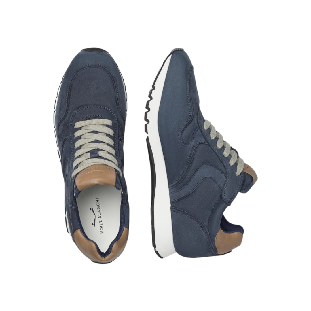 Sneaker in nabuk con topponcino a contrasto. Soletta interna anatomica e antibatterica, fondo in gomma ultra leggera.