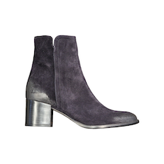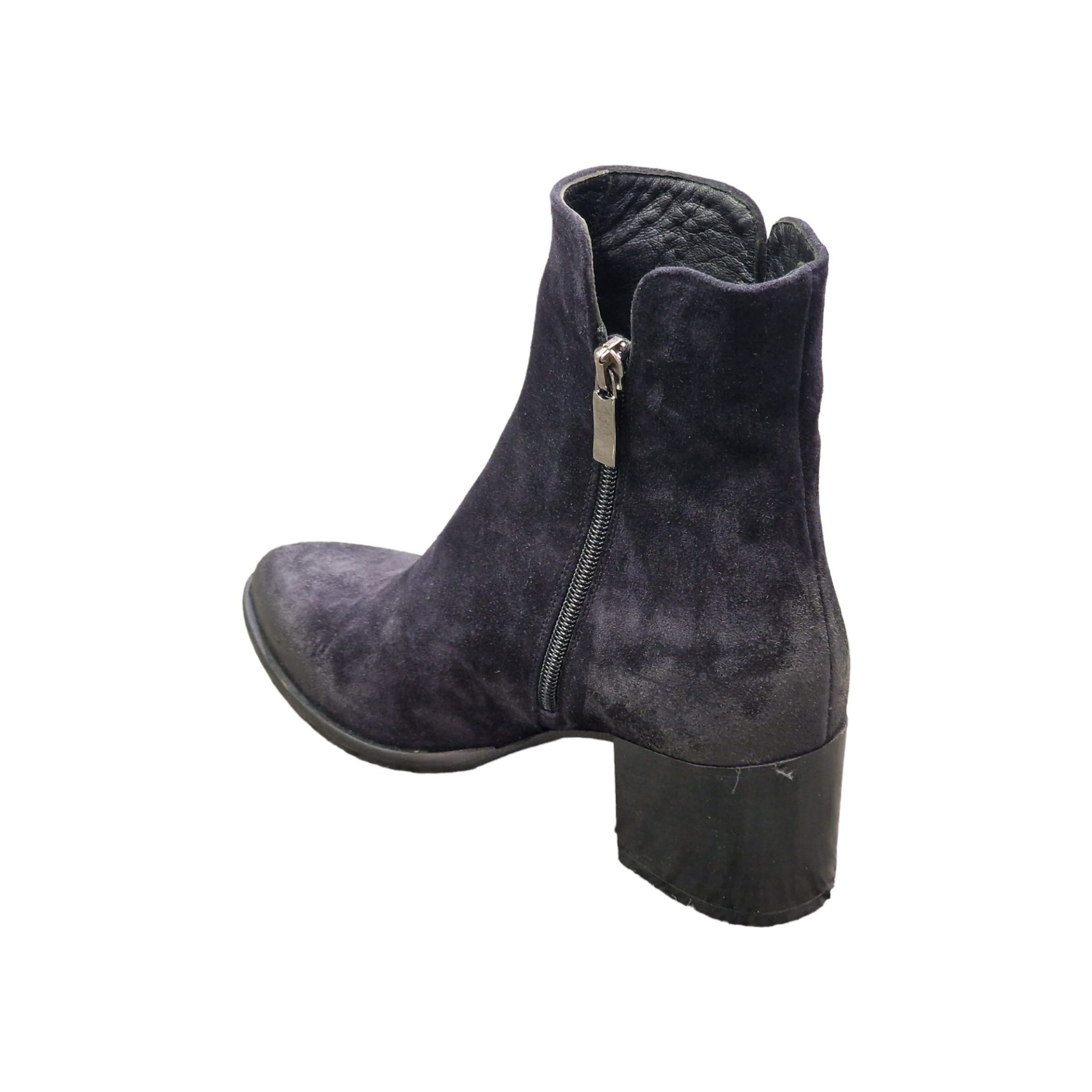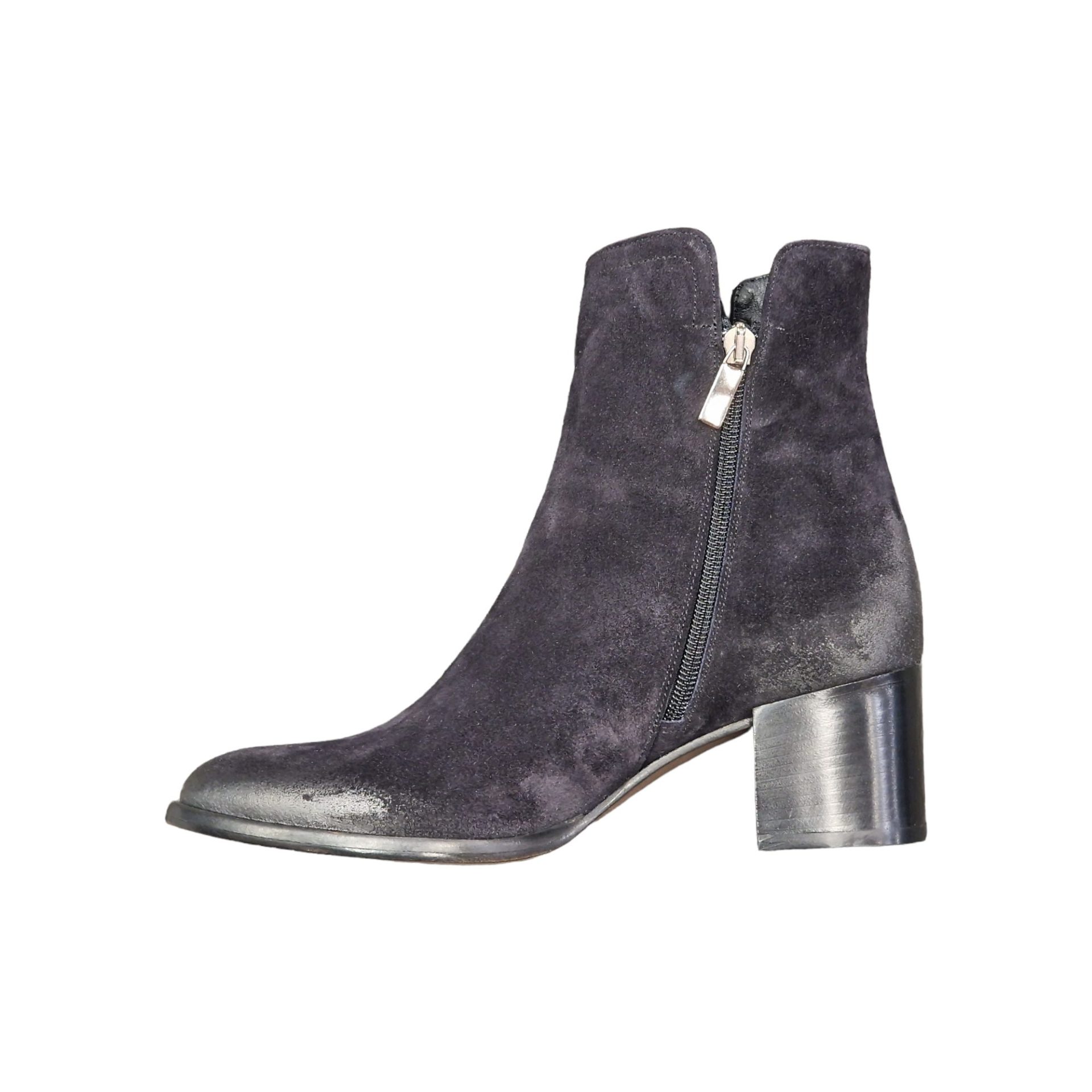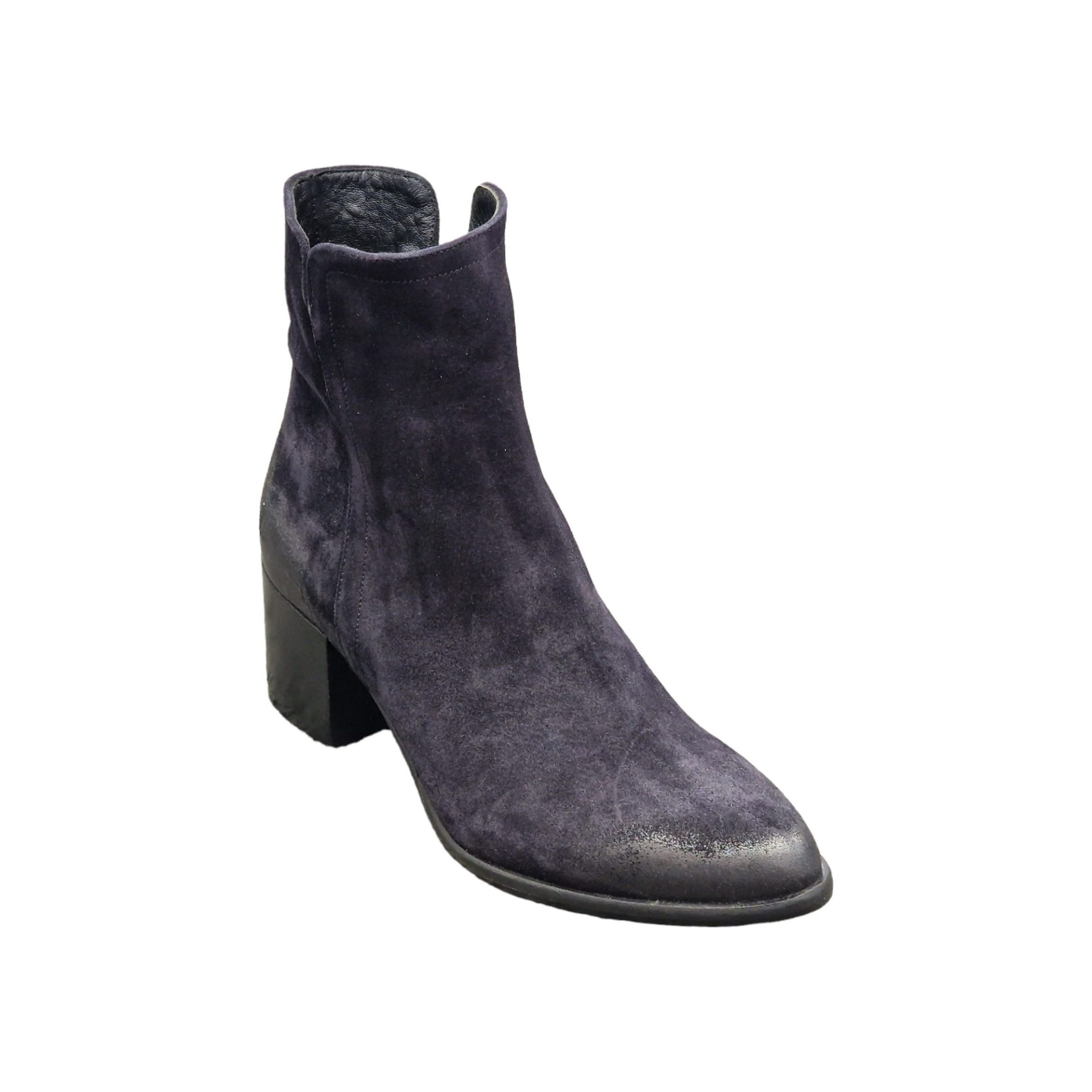 Stivaletto in camoscio blu. Chiusura laterale con zip. Interno in pelle. Gambale con spacco laterale. Suola in cuoio con tacco di 60 mm.